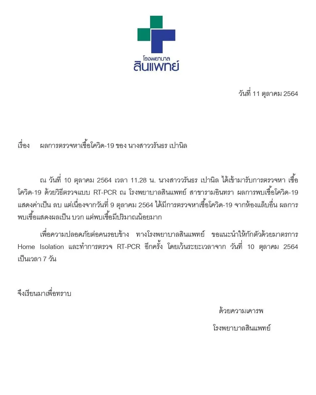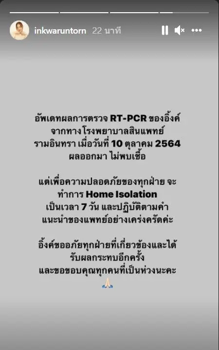อิ้งค์ วรันธร แจ้งพบการตรวจโควิด-19 ครั้งที่2 แพทย์ยืนยันไม่พบเชื่อ แต่เพื่อความปลอดภัย จะทำการกักตัวเองต่ออีก 7 วันตามคำแนะนำแพทย์ พร้อมขอโทษทุกคนที่ได้รับผลกระทบ
