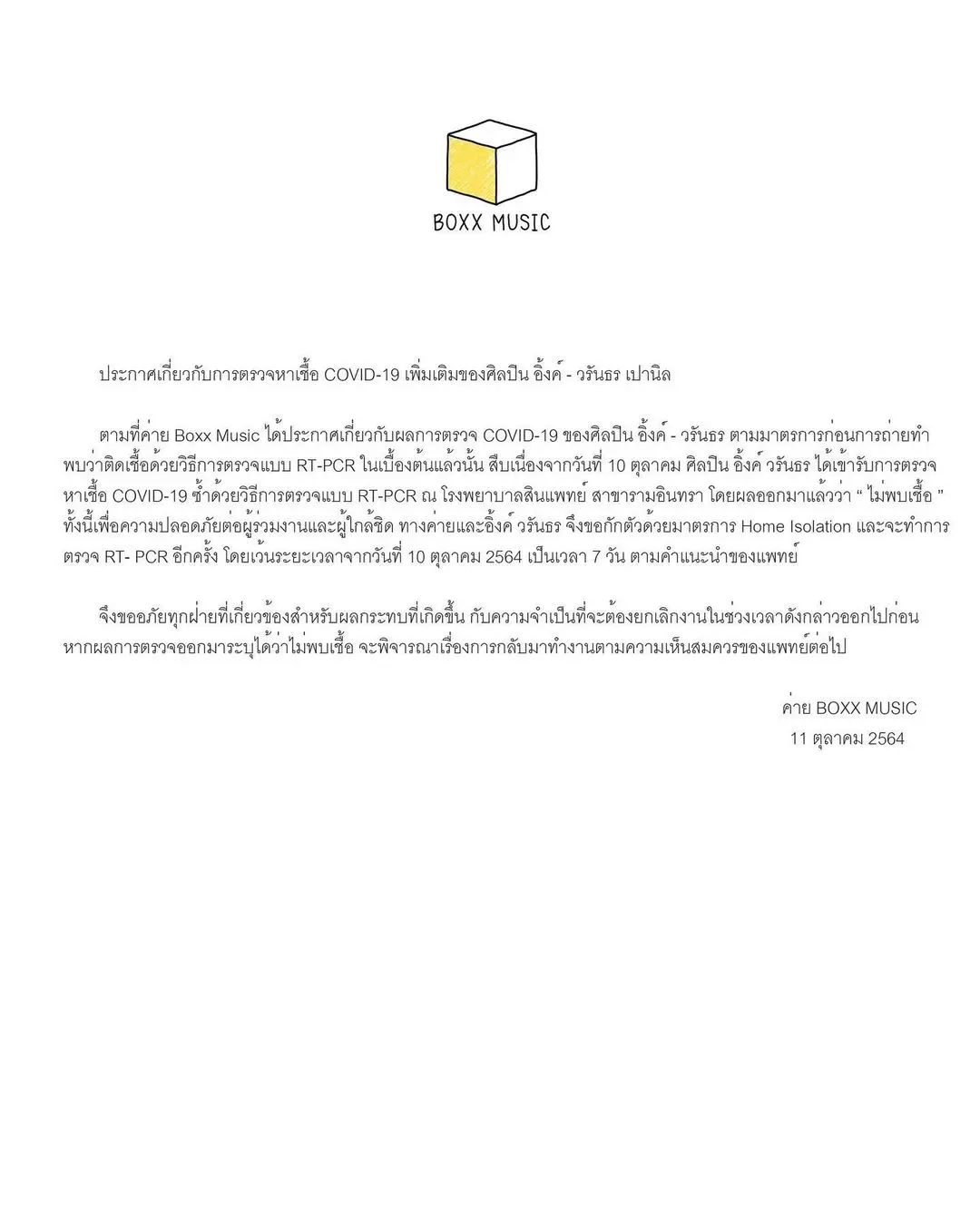 จากที่เมื่อวันที่ 10 ตุลาคม 2564 ทางค่าย Boxx Music ได้ออกมาชี้แจงว่า อิ้งค์ วรันธร เปานิล ศิลปินในสังกัด ได้มีตรวจพบเชื้อโควิด-19จากการตรวจแบบRT-PCR จากที่ก่อนหน้านี้ได้มีทำการตรวจแบบ ATK อยู่เสมอแต่ไม่พบเชื้อ จึงได้ทำการส่งเข้ารับการตรวจหาเชื้อแบบ RT-PCR อีกครั้งหนึ่งที่โรงพยาบาลสินแพทย์ รามอินทรา โดยได้ทำการยกเลิกคิวงานทั้งหมดออกไปก่อน