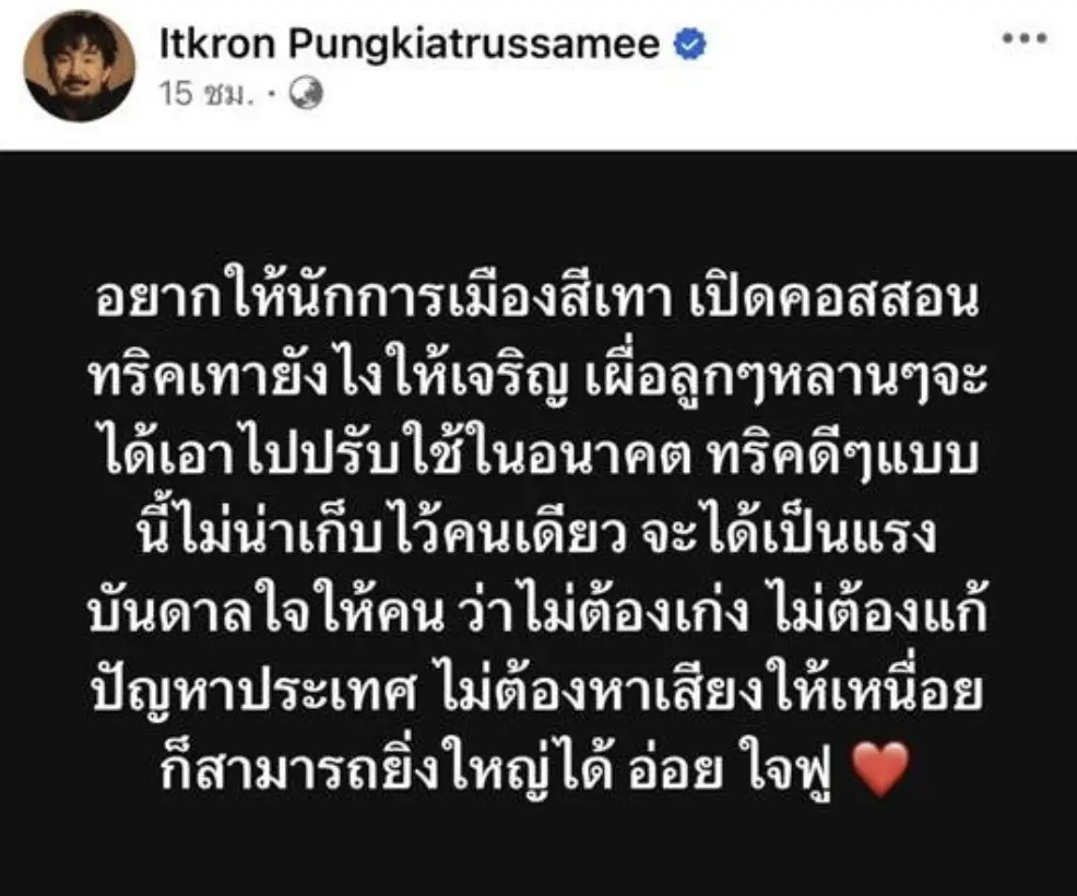 “อยากให้นักการเมืองสีเทา เปิดคอร์สสอนทริกเทายังไงให้เจริญ เผื่อลูก ๆ หลาน ๆ จะได้เอาไปปรับใช้ในอนาคต ทริกดี ๆ แบบนี้ไม่น่าเก็บไว้คนเดียว จะได้เป็นแรงบันดาลใจให้คน ว่าไม่ต้องเก่ง ไม่ต้องแก้ปัญหาประเทศ ไม่ต้องหาเสียงให้เหนื่อย ก็สามารถยิ่งใหญ่ได้ อ่อย ใจฟู”