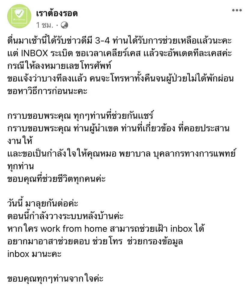 รวมถึง จ๊ะ นงผณี มหาดไทย และ ได๋ ไดอาน่า จงจินตนาการ ที่ได้มีการจัดตั้งเพจ “เราต้องรอด” เพื่อเป็นกระบอกเสียงในการรวบรวมรายชื่อ จัดหาเตียง และ โรงพยาบาล ที่รองรับผู้ป่วยโควิด19