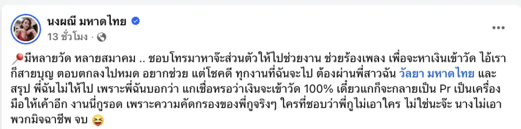 “มีหลายวัด หลายสมาคม ชอบโทรมาหาจ๊ะส่วนตัวให้ไปช่วยงาน ช่วยร้องเพลงเพื่อจะหาเงินเข้าวัด ไอ้เราก็สายบุญ ตอบตกลงไปหมด อยากช่วย แต่โชคดี ทุกงานที่ฉันจะไป ต้องผ่านพี่สาวฉัน วัลยา มหาดไทย และสรุปพี่ฉันไม่ให้ไป เพราะพี่ฉันบอกว่า แกเชื่อหรอว่าเงินจะเข้าวัด 100% เดี๋ยวแกก็จะกลายเป็น PR เป็นเครื่องมือให้เค้าอีก งานนี่กูรอด เพราะความคัดกรองของพี่กูจริงๆ”