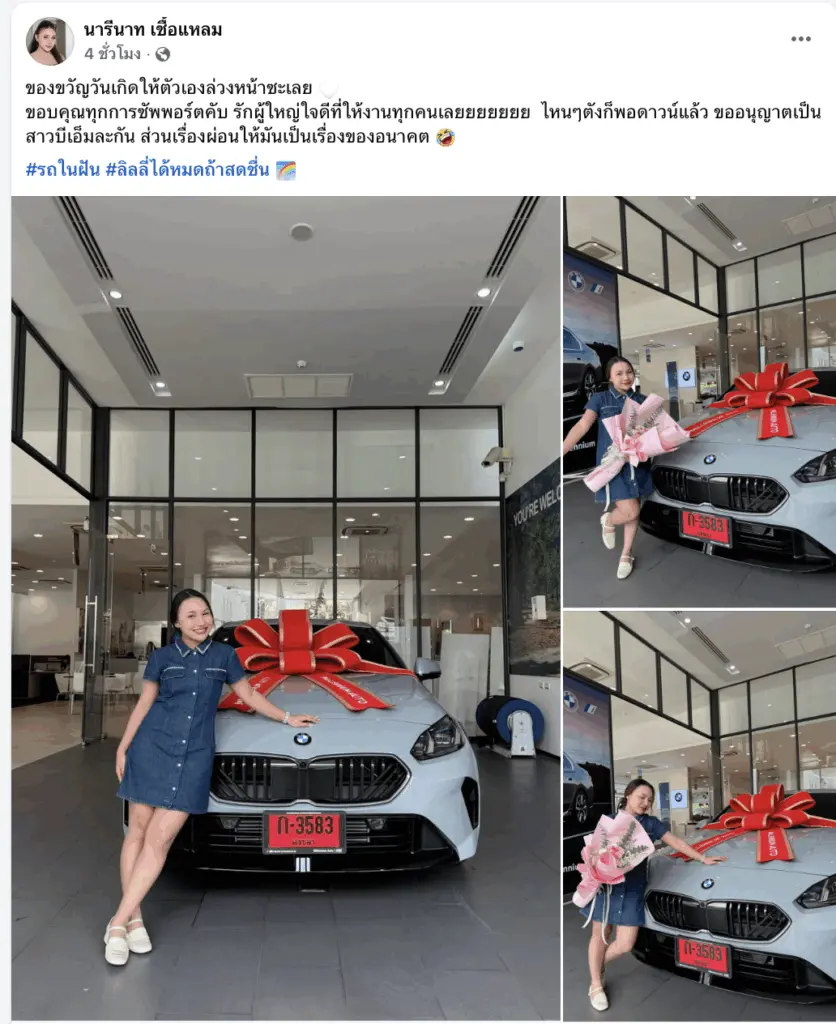 “ของขวัญวันเกิดให้ตัวเองล่วงหน้าซะเลย ขอบคุณทุกการซัพพอร์ตคับ รักผู้ใหญ่ใจดีที่ให้งานทุกคนเลยยยยยยย ไหนๆ ตังค์ก็พอดาวน์แล้ว ขออนุญาตเป็นสาวบีเอ็มละกัน ส่วนเรื่องผ่อนให้มันเป็นเรื่องของอนาคต #รถในฝัน #ลิลลี่ได้หมดถ้าสดชื่น”