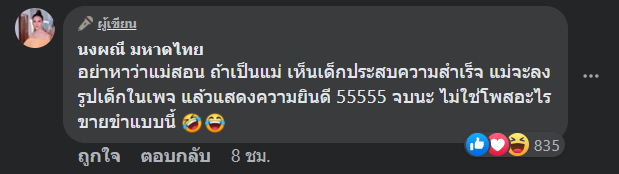 จากนั้น จ๊ะ นงผณี ก็ได้โพสต์ข้อความเพิ่มเติมผ่านทางคอมเมนต์ในโพสต์เดียวกันอีกด้วยว่า ‘อย่าหาว่าแม่สอน ถ้าเป็นแม่ เห็นเด็กประสบความสำเร็จ แม่จะลงรูปเด็กในเพจ แล้วแสดงความยินดี จบนะ ไม่ใช่โพสต์อะไรขายขำแบบนี้’