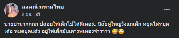 ลูกทุ่งสาว จ๊ะ นงผณี มหาดไทย ออกมาโพสต์แสดงความคิดเห็นผ่านทางเฟซบุ๊ก นิสัยผู้ใหญ่รังแกเด็ก หยุดได้หยุด โดยในข้อความดังกล่าวระบุว่า ‘ขายขำมาก ปล่อยให้เด็กไปได้ดีเหอะ นิสัยผู้ใหญ่รังแกเด็ก หยุดได้หยุดเด้อ หมดยุคแล้ว อยู่ให้เด็กมันเคารพเหอะจ้า’