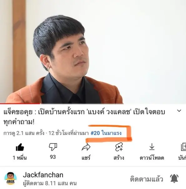 จากกรณีที่ แจ็ค แฟนฉัน ผุดรายการใหม่ทางช่องยูทูปชาแนล Jackfanchan กับรายการ แจ็คขอคุย โดยได้มีการสัมภาษณ์ แบงค์ วงแคลช พร้อมกับเปิดบ้าน ทำเอากระแสตอบรับดีเกินคาดจนติดเทรนด์ 20 มาแรงในยูทูปเลยทีเดียว