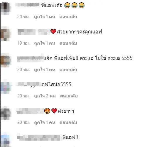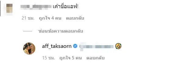ทั้งนี้ด้าน แจ๊ค ก็ได้ออกมาโพสต์รูปภาพด้วยความไวและรีบ จึงทำให้เขียนชื่อนักแสดงสาว แอฟ เป็น เอฟ จนทำเอานักแสดงสาวถึงกับเข้ามาแซวในคอมเมนต์ทันทีว่า พี่เอฟ เอ้ย พี่แอฟ ขอบคุณค่ะ