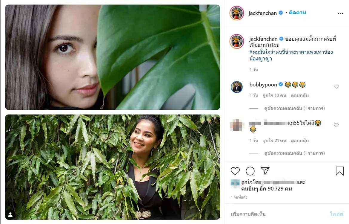 ล่าสุดทางด้าน แจ็ค แฟนฉัน เองก็ออกมาถ่ายรูปแซวสาวญาญ่าด้วยอีกคน ด้วยการจับ ตั๊ก ศิริพร มาถ่ายรูปคู่กับต้นไม้ พร้อมทั้งแท็กสาวญาญ่า และได้ระบุแคปชั่นเอาไว้ว่า ” ขอบคุณแม่ตั๊กมากครับที่เป็นแบบให้ผม #ผมมั่นใจว่าต้นนี้น่าจะราคาแพงเท่าน้องน้องญาญ่า”