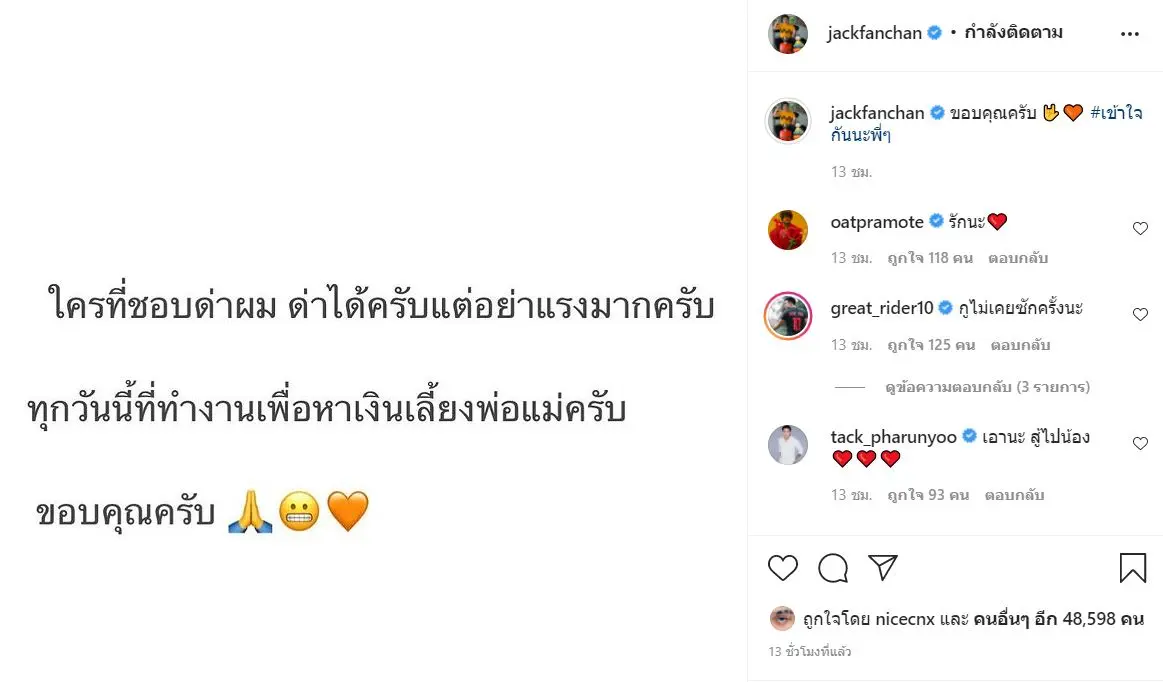 แจ็ค แฟนฉัน โพสต์วอนด่าผมได้แต่อย่างแรงมาก เพราะทำงานหาเงิน คล้ายกำลังตัดพ้อหลังจาก ก่อนหน้านี้ถูกวิจารณ์คอนเทนต์ที่ทำอยู่บ่อยครั้ง