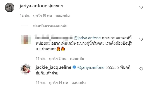และมีคนในวงการจำนวนมากเข้ามาคอมเมนต์แซวทั้งคู่ รวมถึงทางด้านผู้จัดละครอย่าง นก จริยา แอนโฟเน่ จนมีแฟนคลับเข้ามาคอมเมนต์ขอให้ทำละครที่ทั้ง 2 คนเล่นคู่กันสักครั้ง