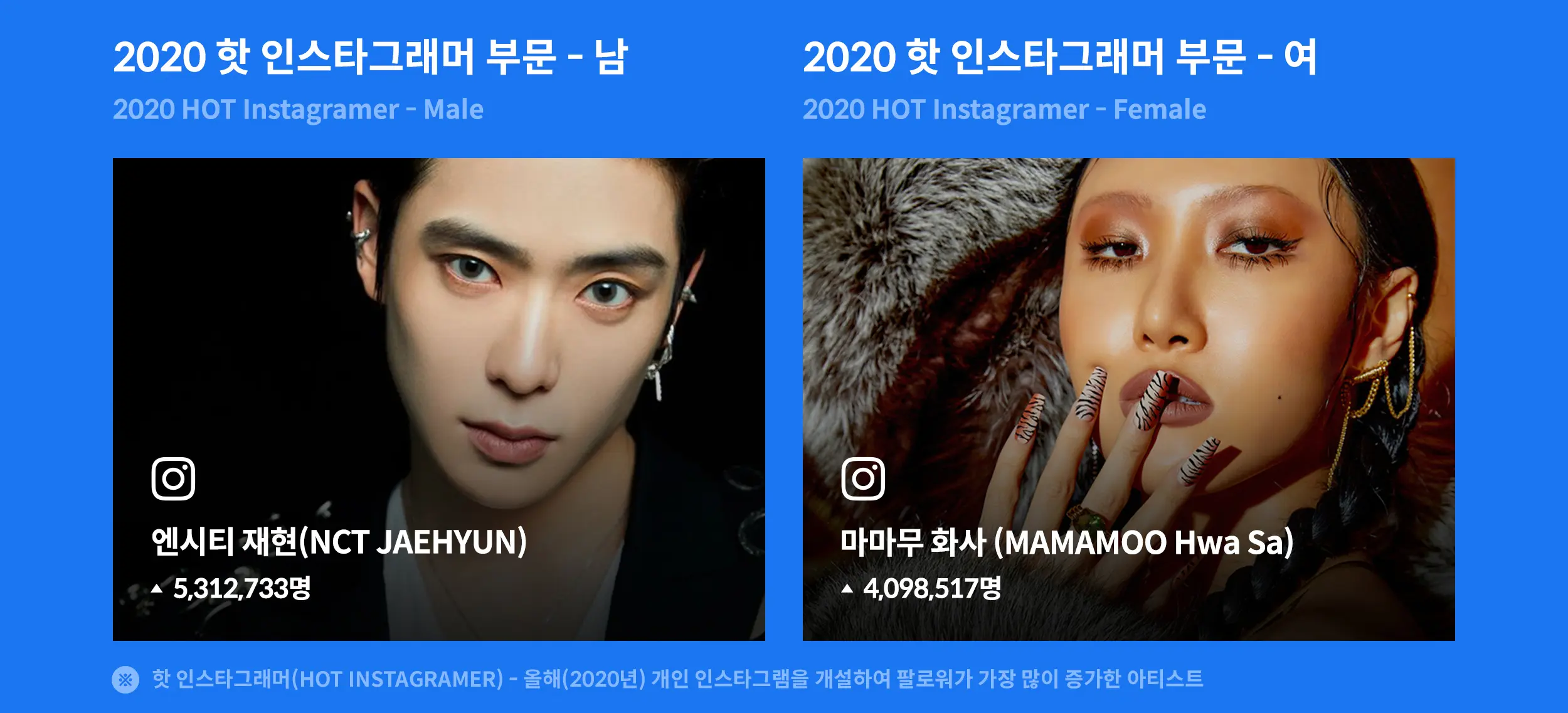 ต้องเรียกได้ว่าเป็น Instagrammer สุดปังจริงๆ กับ แจฮยอน NCT และ ฮวาซา MAMAMOO ที่แม้ว่าจะเพิ่งเปิดไอจีกันมาในปีนี้แต่ก็ไม่สามารถหยุดยั้งความปังของทั้งคู่ได้ โดยล่าสุด ได้มีการจัดอันดับ K-POP Radar 2020 ซึ่งทั้งคู่ก็ได้รับรางวัล Hot Instagrammer กันไป ทำเอาเหล่าแฟนๆ เป็นปลื้มกันสุดๆ