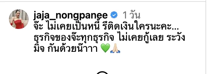 “จ๊ะ ไม่เคยเป็นหนี้ หรือติดเงินใครนะคะ… ธุรกิจของจ๊ะทุกธุรกิจ ไม่เคยกู้เลย ระวังมิจกันด้วยน๊าาา”