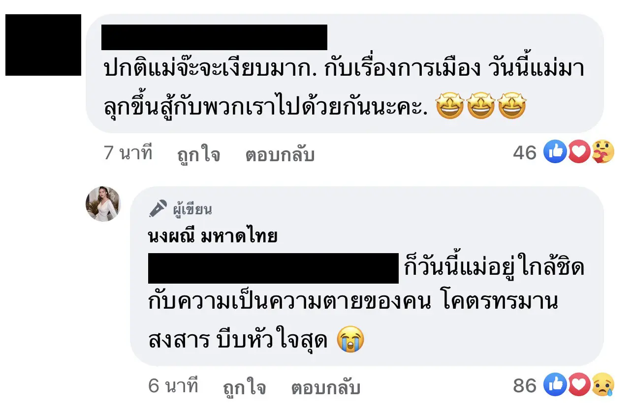 ด่านแฟนคลับก็เข้ามาคอมเมนต์อย่างมากมาย พร้อมมีชาวเน็ตคนนึ่งเข้ามาคอมเมนต์ว่า ปกติแม่จ๊ะจะเงียบมาก กับเรื่องการเมือง วันนี้แม่มาลุกขึ้นสู้กับพวกเราไปด้วยกันนะคะ ด้านจ๊ะ ก็ตอบกลับคอมเมนต์นี้ไปว่า ก็วันนี้แม่อยู่ใกล้ชิดกับความเป็นความตายของคน โครตทรมาณ สงสาร บีบหัวใจ