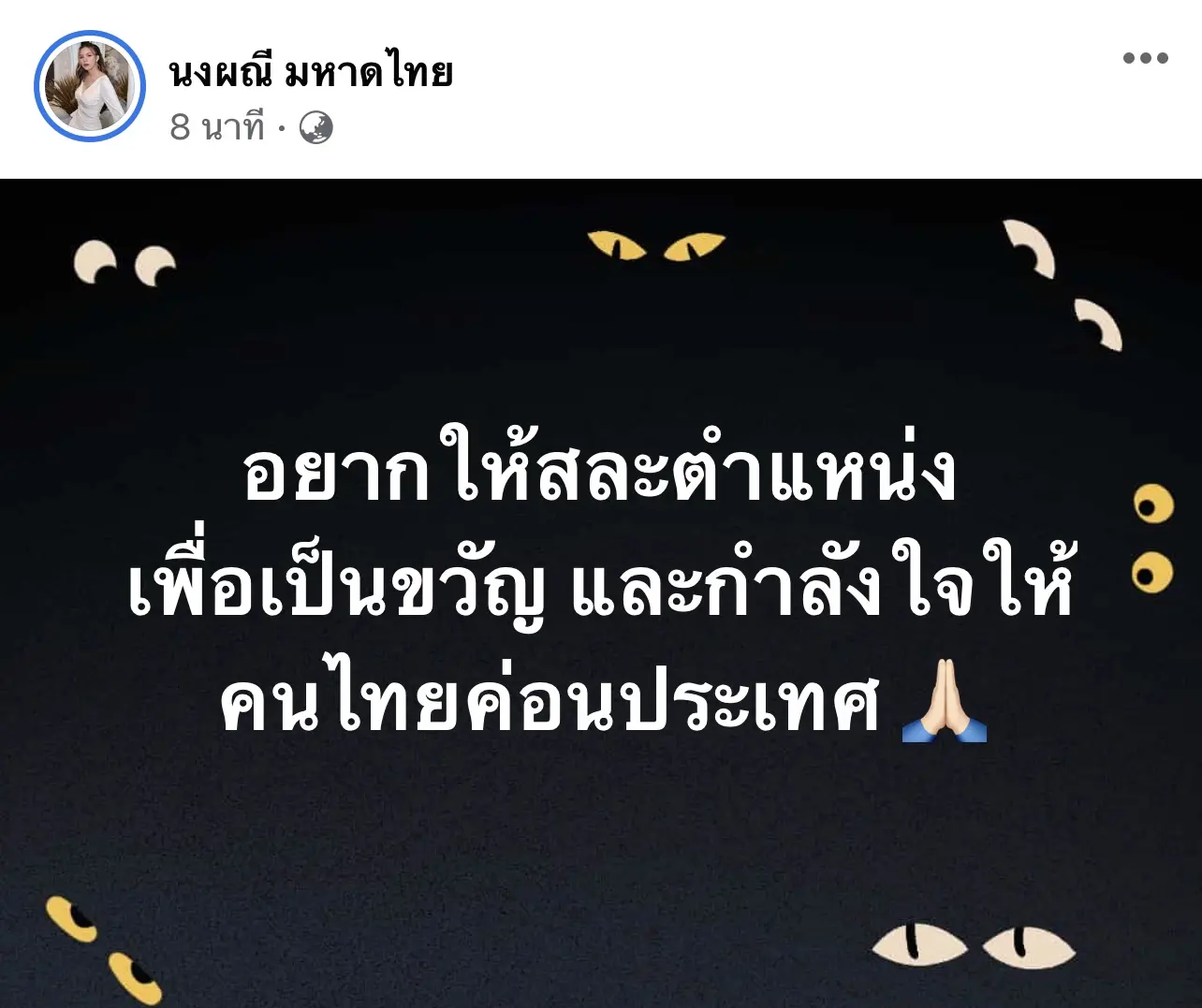 ล่าสุด สาวจ๊ะ สุดทนโพสต์แคปลั่นว่า อย่ากให้สละตำแหน่ง เพื่อเป็นขวัญและกำลังใจให้คนไทยค่อนประเทศ