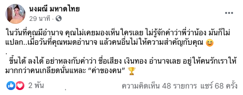 จ๊ะ นงผณี โพสต์ร่ายยาวหมายถึงใครย่าหลงกับคำว่าชื่อเสียง เงินทอง อำนาจ แฟนเพลงแห่คอมเมนต์เพียบ บอกโพสต์นี้มงลงแล้ว