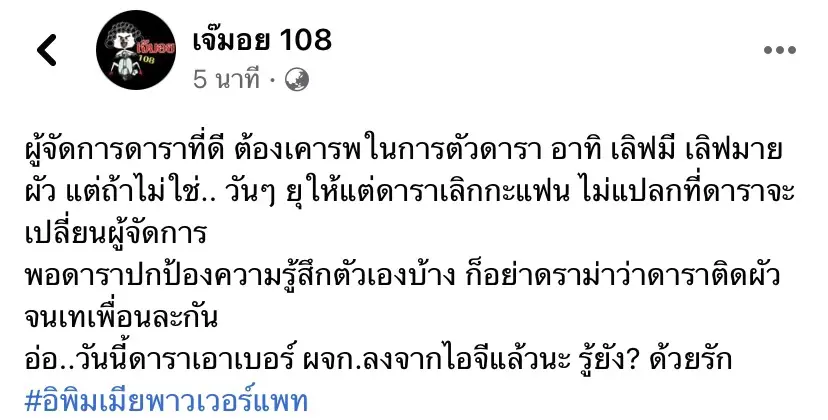 ล่าสุด ความขี้เผือกของชาวเน็ตก็ยังไม่จบแต่เพียงเท่านี้ เมื่อเพจดัง อย่าง เจ๊มอย108 ได้มีการทิ้งปริศนาชุดใหญ่ว่า “ผู้จัดการดาราที่ดี ต้องเคารพในการตัวดารา อาทิ เลิฟมี เลิฟมายผัว แต่ถ้าไม่ใช่.. วันๆยุให้แต่ดาราเลิกกับแฟน ไม่แปลกที่ดาราจะเปลี่ยนผู้จัดการ พอดาราปกป้องความรู้สึกตัวเองบ้าง ก็อย่าดราม่าว่าดาราติดผัว จนเทเพื่อนละกัน อ่อ..วันนี้ดาราเอาเบอร์ ผู้จัดการลงจากไอจีแล้วนะ รู้ยัง? ด้วยรัก #อิพิมเมียพาวเวอร์แพท”