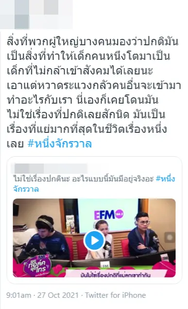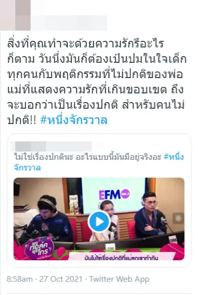 แฮชแท็ก #หนึ่งจักรวาล พุ่งทะยานขึ้นสู่อันดับ1 ในทวิตเตอร์ โดยก็มีหลายๆคนออกยกตัวอย่างเคสที่คนในครอบครัวทำการล่วงละเมิดเด็กเองอยู่หลายเคส และมีอยู่เคสหนึ่งซึ่งออกมาเปิดเผยความรู้สึกทางฝั่งของลูกผ่านทางรายการ พุธทอล์คพุธโทร ที่มีแม่คอยทำการจับเนื้อต้องตัวลูกชายอยู่เสมอ จนตัวเจ้ารู้สึกเป็นปมอยู่ภายใน ทำให้ชาวเน็ตยกขึ้นมาเป็นเคสตัวอย่างต่อเหตุการณ์ของ หนึ่งจักรวาล