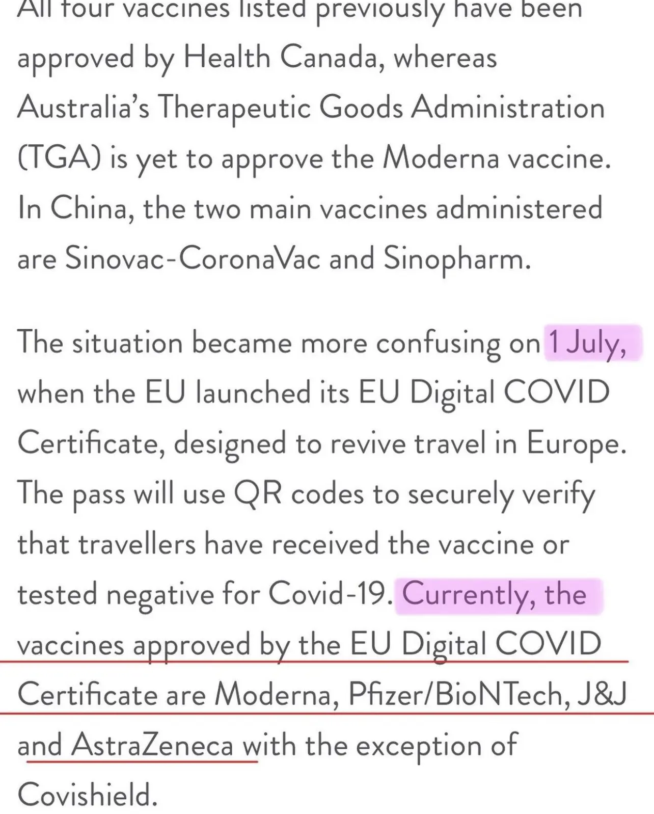 พร้อมแนบภาพเรื่องของวัคซีนที่ EU สหภาพยุโรปยอมรับ ที่ยอมรับ Moderna , Pfizer/BioNTech , J&j และ AstraZeneca ซึ่งจากเอกสารที่เจ้าตัวได้นำมาโพสต์ในครั้งนี้จะเห็นว่า EU สหภาพยุโรป ไม่ได้มีการรองรับวัคซีนยี่ห้อ Sinovac แต่อย่างใด