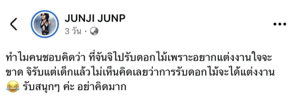 “ทำไมคนชอบคิดว่าที่จันจิไปรับดอกไม้เพราะอยากแต่งงานใจจะขาด จิรับแต่เด็กแล้ว ไม่เห็นคิดเลยว่าการรับดอกไม้จะได้แต่งงาน รับสนุก ๆ ค่ะ อย่าคิดมาก”