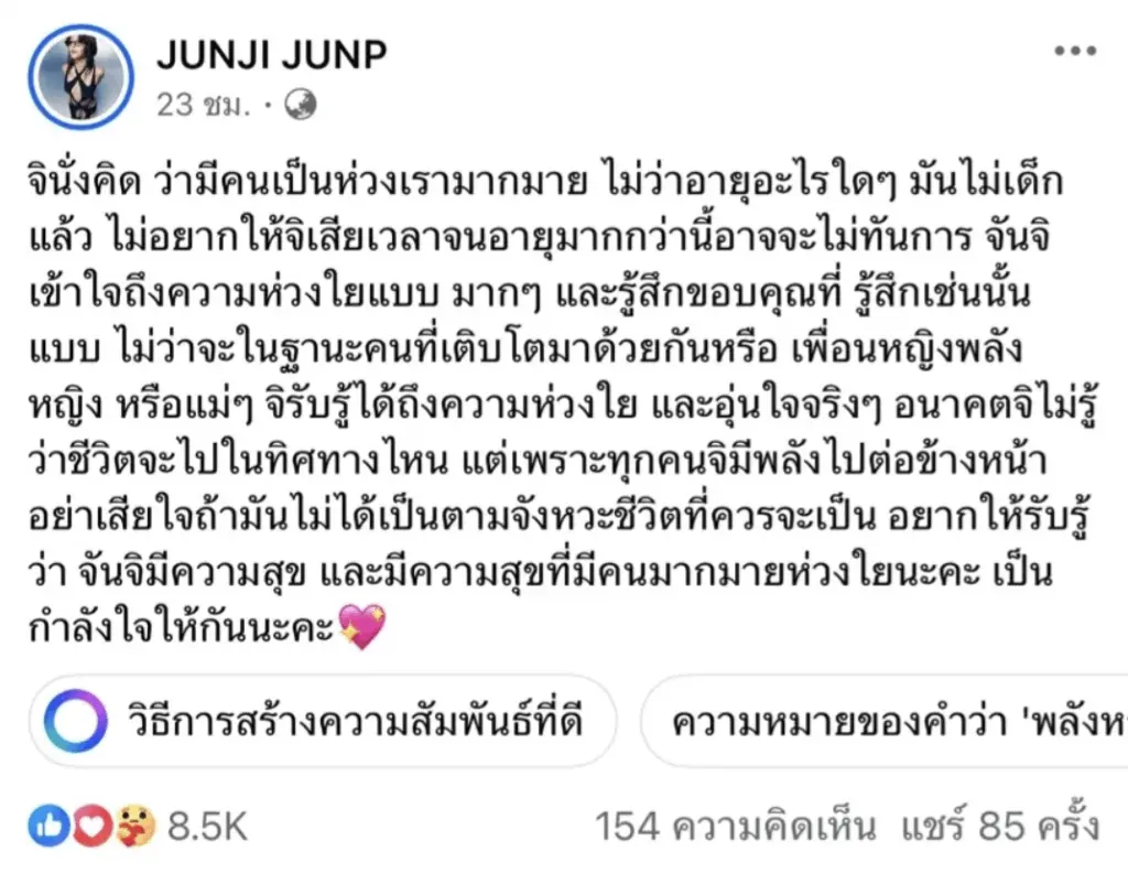 “จินั่งคิดว่ามีคนเป็นห่วงเรามากมาย ไม่ว่าอายุอะไร มันไม่เด็กแล้ว ไม่อยากให้จิเสียเวลาจนอายุมากกว่านี้อาจจะไม่ทันการ จันจิเข้าใจถึงความห่วงใย และรู้สึกขอบคุณจริง ๆ อนาคตไม่รู้จะเป็นยังไง แต่เพราะทุกคน จิมีพลังไปต่อข้างหน้า อย่าเสียใจถ้ามันไม่ได้เป็นตามจังหวะชีวิตที่ควรจะเป็น อยากให้รู้ว่า จันจิมีความสุข และมีความสุขที่มีคนมากมายห่วงใยนะคะ”