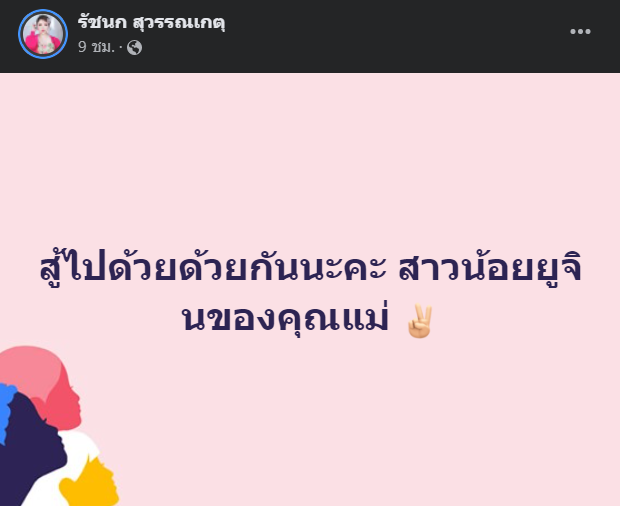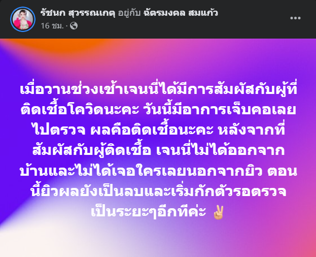 ‘เมื่อวานช่วงเช้าเจนนี่ได้มีการสัมผัสกับผู้ที่ติดเชื้อโควิดนะคะ วันนี้มีอาการเจ็บคอเลยไปตรวจ ผลคือติดเชื้อนะคะ หลังจากที่สัมผัสกับผู้ติดเชื้อ เจนนี่ไม่ได้ออกจากบ้านและไม่ได้เจอใครเลยนอกจากยิว ตอนนี้ยิวผลยังเป็นลบและเริ่มกักตัวรอตรวจเป็นระยะ ๆ อีกทีค่ะ’ ซึ่งภายจากที่เจ้าตัวได้แจ้งข่าวการติดเชื้อผ่านทางเฟซบุ๊ก เจนนี่ รัชนก ก็ยังได้โพสต์ข้อความเพิ่มเติมถึงน้องยูจินอีกด้วยว่า ‘สู้ไปด้วยกันนะคะ สาวน้อยยูจินของคุณแม่’