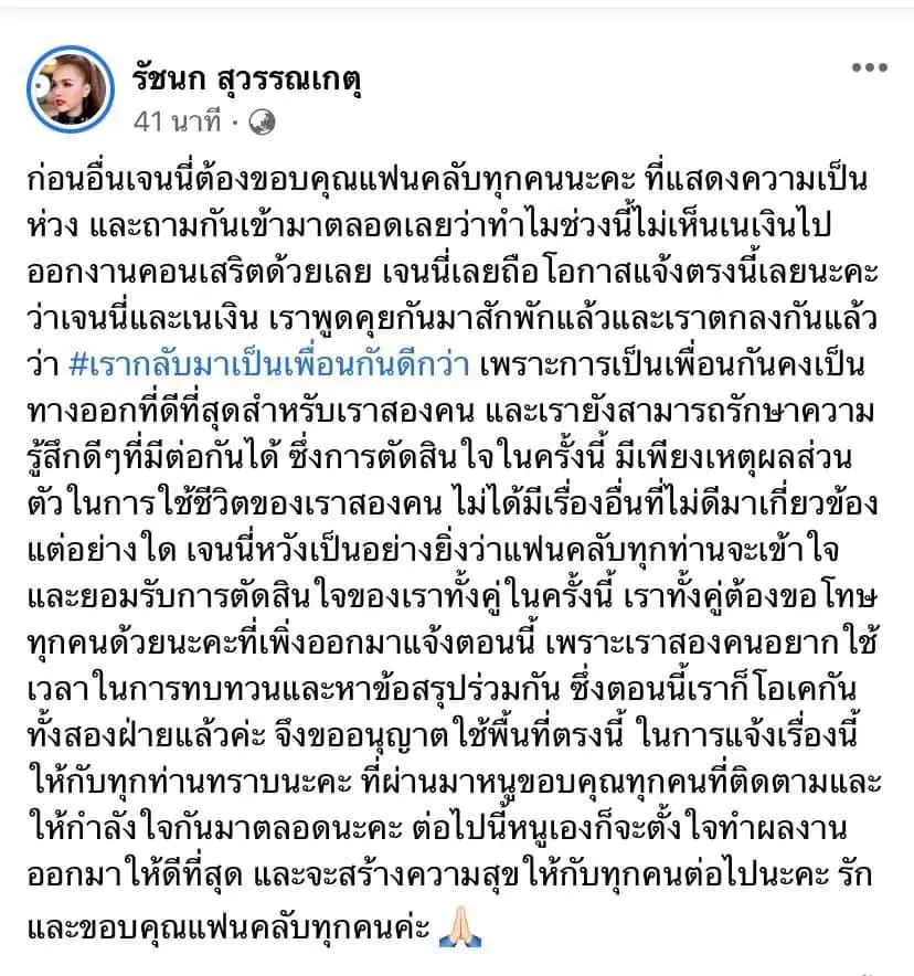 เราทั้งคู่ต้องขอโทษทุกคนด้วยนะคะที่เพิ่งออกมาแจ้งตอนนี้ เพราะเราสองคนอยากใช้เวลาในการทบทวนและหาข้อสรุปร่วมกัน ซึ่งตอนนี้เราก็โอเคกันทั้งสองฝ่ายแล้วค่ะ จึงขออนุญาตใช้พื้นที่ตรงนี้ ในการแจ้งเรื่องนี้ให้กับทุกท่านทราบนะคะ ที่ผ่านมาหนูขอบคุณทุกคนที่ติดตามและให้กำลังใจกันมาตลอดนะคะ ต่อไปนี้หนูเองก็จะตั้งใจทำผลงานออกมาให้ดีที่สุด และจะสร้างความสุขให้กับทุกคนต่อไปนะคะ รักและขอบคุณแฟนคลับทุกคนค่ะ