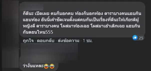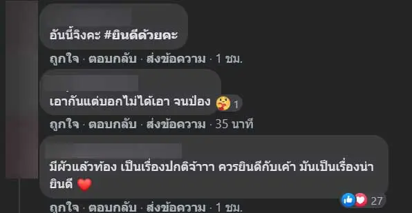 งานนี้ทำเอาบรรดาชาวเน็ตต่างเห็นด้วยกันยกใหญ่ พร้อมกับคอมเมนต์อีกด้วยว่า ก็ดีนะ เปิดเผย คบก็บอกคบ ท้องก็บอกท้อง ดาราบางคนแอบกิน แอบท้อง อันนี้เค้าชัดเจนตั้งแต่คบกันเป็นเรื่องที่ดีนะให้เกียรติผู้หญิงดี ดาราบางคน โผล่มาท้องเฉย โผล่มาเอ้าเลิกเฉย แอบกินกันตอนไหน555 , อันนี้จริงค่ะ #ยินดีด้วยค่ะ , เ-ากันแต่บอกไม่ได้เ-า จนป่อง , มีผัวแล้วท้อง เป็นเรื่องปกติจ้าาา ควรยินดีกับเค้า มันเป็นเรื่องน่ายินดี
