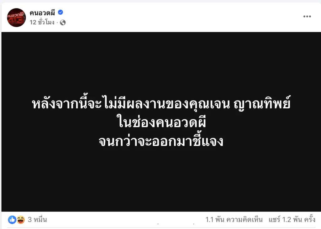 กลายเป็นอีกหนึ่งประเด็นร้อนที่แฟนรายการสายลี้ลับให้ความสนใจอย่างมาก หลังเพจ “คนอวดผี” รายการดังแนวเหนือธรรมชาติ ออกมาโพสต์ข้อความชัดเจนถึง “เจน ญาณทิพย์” ว่า “หลังจากนี้จะไม่มีผลงานของคุณเจน ญาณทิพย์ ในช่องคนอวดผีจนกว่าจะออกมาชี้แจง”