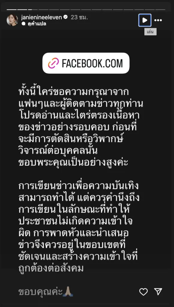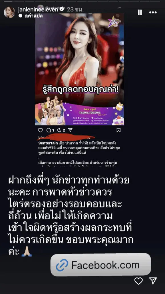 ล่าสุดทางฝั่ง เจนี่ เทียนโพธิ์สุวรรณ ก็ไม่ได้นิ่งเฉย ได้ออกมาเคลื่อนไหวผ่านอินสตาแกรมสตอรี่ โดยระบุข้อความขอให้แฟนๆ และผู้ติดตามข่าวช่วยไตร่ตรองก่อนตัดสินหรือวิพากษ์วิจารณ์ใคร พร้อมย้ำว่า