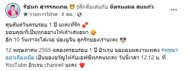 โดยเจนนี่ได้โพสต์ภาพพร้อมข้อความลงในเฟซบุ๊กว่า สุขสันต์วันครบรอบ 1 ปี นะคะที่รัก 💕ขอบคุณที่เป็นทุกอย่างให้เค้าเสมอมา ☺️ อีก 10 วันเราจะได้เจอ น้องยูจิน ลูกรักของเรานะคะ 👧🏻 12 พฤษภาคม 2565 ฉลองครอบรอบ 1 ปี ยิวเจน ขอมอบผลงานเพลง #กรุณาอย่าเถียงเมีย เป็นของขวัญให้กับเอฟซีทุกคนนะคะ วันนี้เวลา 12.12 น. ที่ YouTube ยิวเจน channel นะคะ ♥️ ท่ามกลางแฟน ๆ ที่เข้ามาคอมเมนต์อย่างมากมาย รวมถึงสามีสุดที่รักก็เข้ามาคอมเมนต์ด้วยเช่นกันว่า รักนะคะ