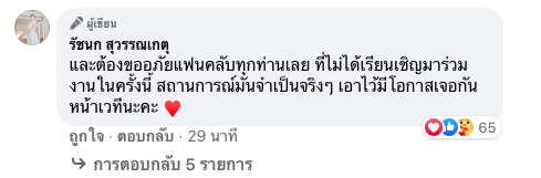 และต้องขออภัยแฟนคลับทุกท่านเลย ที่ไม่ได้เรียนเชิญมาร่วมงานในครั้งนี้ สถานการณ์มันจำเป็นจริงๆ เอาไว้มีโอกาสเจอกันหน้าเวทีนะคะ ![]()