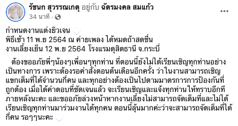 เจนนี่ รัชนก หรือ เจนนี่ ได้หมด ถ้าสดชื่น โพสต์เผยกำหนดการงานแต่งยิวเจน วันที่ 11 พฤศจิกายน 2564 ขออภัยแฟนคลับที่ไม่สามารถมางานได้