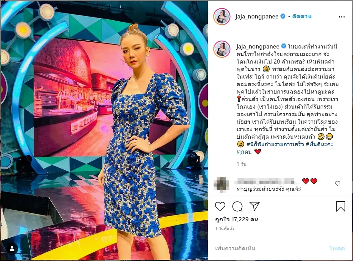 “ในขณะที่ทำงานวันนี้ คนโทรให้กำลังใจและถามเยอะมาก จ๊ะ โดนโกงเงินไป 20 ล้านหรอ? เห็นพี่มดดำพูดในข่าว ? พร้อมกับคนส่งข้อความมาในเฟส ไอจี ถามว่า คุณจ๊ะได้เงินคืนมั้ยคะ ตอบตรงนี้นะคะ ไม่ได้ค่ะ ไม่ได้จริงๆ จ๊ะเคยพูดไปแล้วในรายการแฉลองไปหาดูนะคะ ?ส่วนตัว เป็นคนโทษตัวเองก่อน เพราะเราโลภเอง (เราโง่เอง) ส่วนเค้าก็ได้รับกรรมของเค้าไป กรรมใครกรรมมัน สุดท้ายอย่างน้อยๆ เราก็ได้รับบทเรียน ในความโลภของเราเอง ทุกวันนี้ ทำงานตั้งแต่เช้ายันค่ำ ไม่บ่นสักคำสู้สุด เพราะเงินหมดแล้ว ??? #นี่ก็พึ่งถ่ายรายการเสร็จ #ฝันดีนะคะทุกคน ?”