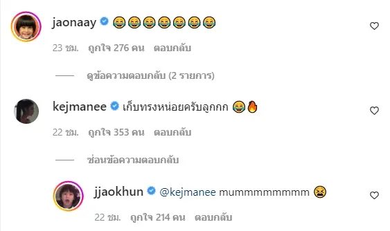 งานนี้ก็ทั้งพี่ชายอย่าง เจ้านาย จิณเจษฎ์ และ แม่ เข้ามาคอมเมนต์แซวเจ้าขุนกันยกใหญ่ ซึ่งทางด้านของเจ้านายก็ได้มีการเอารูปของน้องชายไปลงที่ไอจีของตัวเองพร้อมทั้งบอกด้วยว่า “bro s dream came true” หรือความฝันของน้องชายเป็นจริงแล้ว