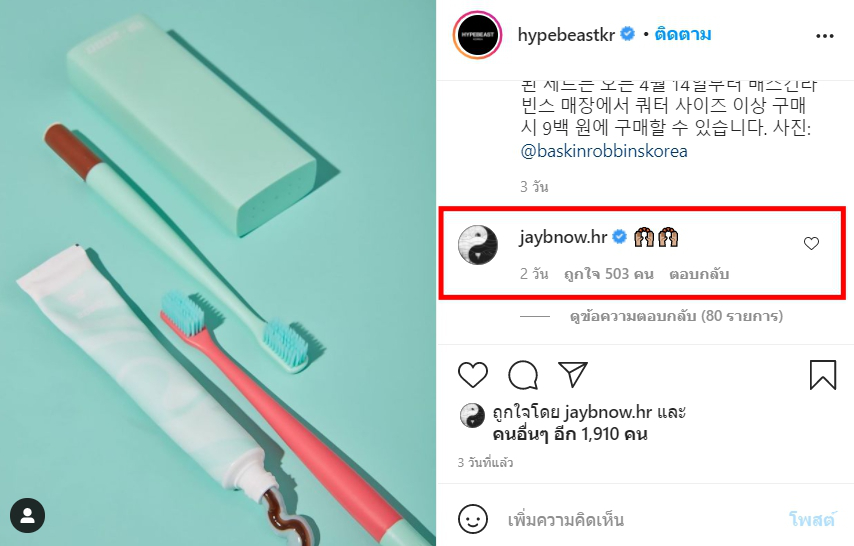 ด้านหนุ่ม เจบี ลีดเดอร์สุคชิคแห่งวง GOT7 ก็ดูจะตื่นเต้นกับสิ่งๆ นี้เป็นอย่างมาก เข้าแสดงตัวกดถูกใจพร้อมคอมเมนต์ใต้โพสต์ของ HYPEBEAST Korea ทันที ด้วยอีโมจิยกมือสุดน่ารัก บ่งบอกชัดเจนเลยว่าแฟนตัวยงมินท์ช็อคโกอยู่ตรงนี้!