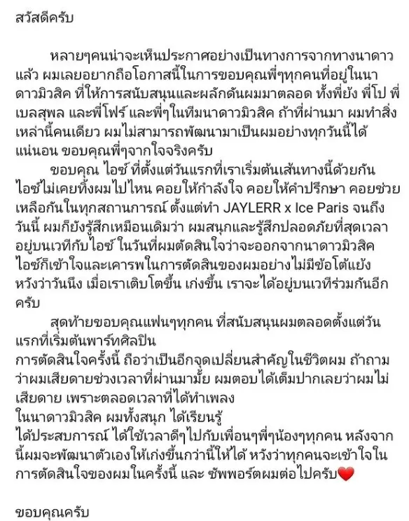 ถ้าที่ผ่านมา ผมทำสิ่งเหล่านี้คนเดียว ผมไม่สามารถพัฒนามาเป็นผมอย่างทุกวันนี้ได้แน่นอน ขอบคุณพี่ๆจากใจจริงครับ ขอบคุณ ไอซ์ ที่ตั้งแต่วันแรกที่เราเริ่มต้นเส้นทางนี้ด้วยกัน ไอซ์ไม่เคยทิ้งผมไปไหน คอยให้กำลังใจ คอยให้คำปรึกษา คอยช่วยเหลือกันในทุกสถานการณ์ ตั้งแต่ทำ JAYLERR x Ice Paris จนถึง วันนี้ ผมก็ยังรู้สึกเหมือนเดิมว่า ผมสนุกและรู้สึกปลอดภัยที่สุดเวลาอยู่บนเวทีกับไอซ์