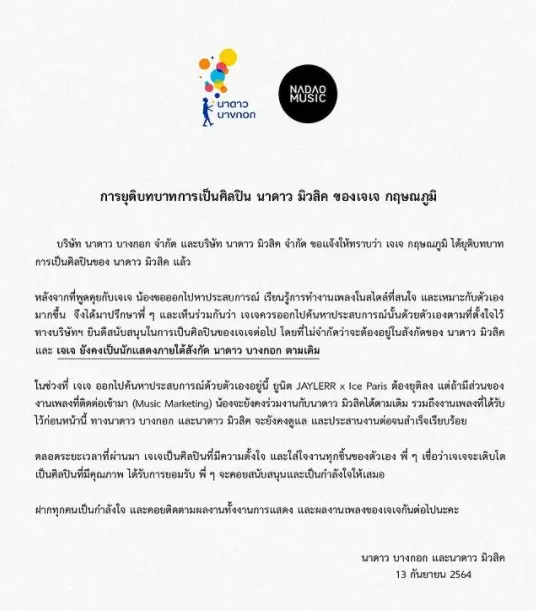นาดาว มิวสิค ประกาศยุติบทบาท เจเจ กฤษณภูมิ เรียบร้อยแล้ว