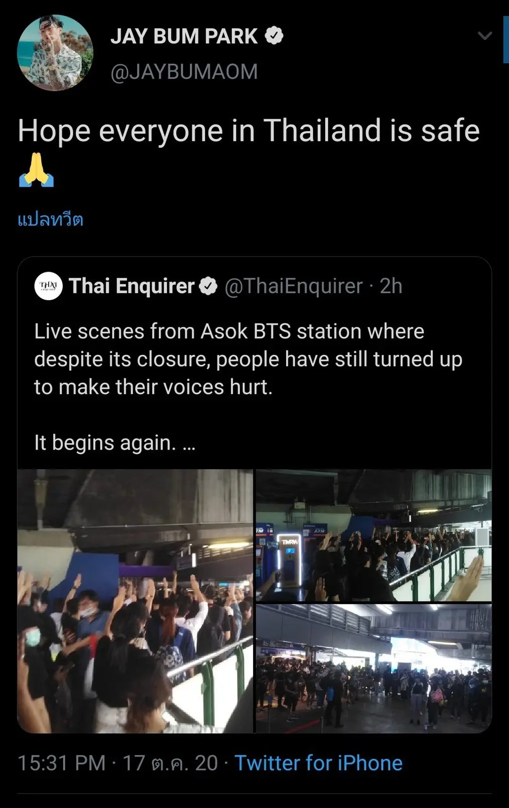 หลังจากนั้นไม่นาน Jay Park ศิลปินเกาหลีชื่อดังที่มีแฟนคลับอย่างถล่มทลายทั่วโลก ได้ออกมาแชร์โพสต์จาก Instagram ของ เวย์ และใช้ Emoji หรือ สัญลักษณ์รูป “ไหว้” แทนคำพูดทุกอย่าง ทำเอาเหล่าแฟนคลับชาวไทยต่างพากันดีใจและขอบคุณสำหรับการออกมาช่วยกระจายข่าวในครั้งนี้ ซึ่งในการออกมาแชร์ครั้งนี้ชอบเขาไม่ใช่ครั้งแรก Jay Park ได้ออกมาพูดถึงสถานการณ์ประเทศไทย ผ่านพื้นที่ส่วนตัวของเขาอยู่บ่อยครั้ง