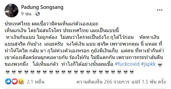 แจ๊ส ผดุง ก็ได้ออกมาโพสต์แสดงความเห็นต่อเรื่องดังกล่าวผ่านทางเฟซบุ๊คส่วนตัว Padung Songsang ว่า