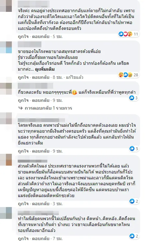 ซึ่งดังกล่าว ต่างมีคนพากันมาแสดงความเห็นวิพากษ์วิจารณ์ต้นตอของการแพร่ระบาดโควิด-19 ในรอบนี้ โดยเฉพาะเกี่ยวกับแนวชายแดน การควบคุมการหลั่งไหลของแรงงาน รวมไปถึงการแสดงความเห็นด้วยกับหนุ่มแจ๊ส ว่า ไม่มีเงินเก็บแล้วจริง ๆ จะกลับบ้านไปปีใหม่ก็ไม่ได้ และอยากขอให้การหากินแบบไม่สุจริตและการคอรัปชั่นหายไปด้วย