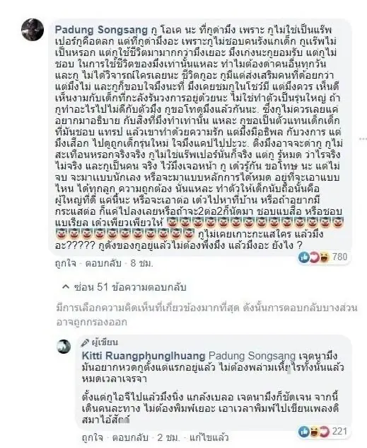 หลังจากที่โพสต์ดังกล่าวได้ถูกเผยแพร่ออกไปก็ทำให้มีเหล่าชาวเน็ตเข้ามาแสดงความเห็นเป็นจำนวนมาก หนึ่งในนั้นเป็นนักแสดงตลกชื่อดังอย่าง แจ๊ส ชวนชื่น ได้เข้าไปคอมเมนต์แสดงความเห็นส่นตัวของเขาเองเกี่ยวกับพฤติกรรมการใช้ชีวิตของแรปเปอร์ ก่อนจะบอกเอาไว้ว่าากนี้เดินคนละทาง ก่อนที่คอมเมนต์ดังกล่าวนั้นจะถูกลบไปในที่สุด