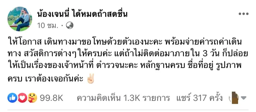 ซึ่ง เจนนี่ ได้โพสต์เหตุการณ์ขณะพูดคุยเจรจากับคนร้าย พร้อมทิ้งข้อความไว้ว่า “ให้โอกาส เดินทางมาขอโทษด้วยตัวเองนะคะ พร้อมจ่ายค่ารถค่าเดินทาง สวัสดิการต่างๆให้ครบค่ะ แต่ถ้าไม่ติดต่อมาภายใน 3 วัน ก็ปล่อยให้เป็นเรื่องของเจ้าหน้าที่ ตำรวจนะคะ หลักฐานครบ ชื่อที่อยู่ รูปภาพครบ เราต้องเจอกันค่ะ”
