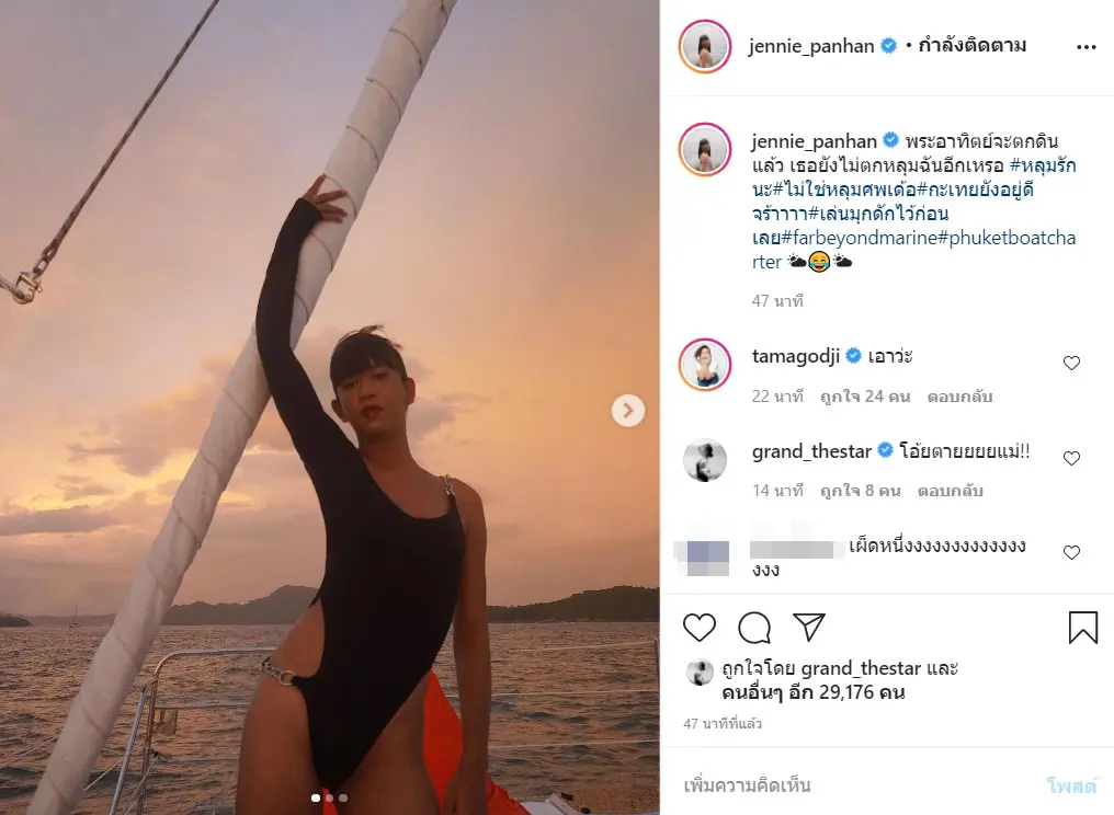 ล่าสุด สาวเจนนี่ก็มาโพสต์รูปลงในอินสตาแกรม เป็นล่องเรือเที่ยวเลสวย ๆ ใส่ชุดว่ายน้ำสีดำแต่มีความแหวกเว้าจนคนเห็นต้องตาพอง ขอบอกเลยว่าหุ่นเซี๊ยะจริง ๆ แต่พอเหลือบมองในส่วนของแคปชั่นแล้ว ก็ต้องหัวเราะออกเสียงเพราะสาวเจนนี่ไม่ทิ้งคอนเซปต์อารมณ์ดี ขอดักก่อน ว่า ‘พระอาทิตย์จะตกดินแล้ว เธอยังไม่ตกหลุมฉันอีกเหรอ #หลุมรักนะ#ไม่ใช่หลุมศพเด้อ#กะเทยยังอยู่ดีจร้าาาา#เล่นมุกดักไว้ก่อนเลย#farbeyondmarine#phuketboatcharter ???’