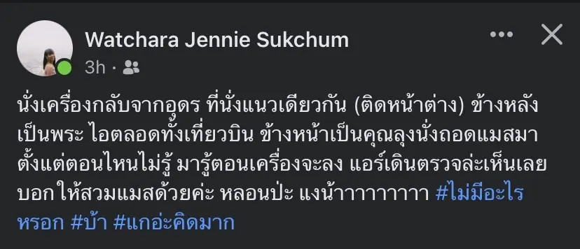 ล่าสุด เจนนี่ ได้มีการโพสต์ข้อความผ่านทางเฟซบุ๊ก Watchara Jennie Sukchum ว่า นั่งเครื่องกลับจากอุดร ที่นั่งแนวเดียวกัน (ติดหน้าต่าง) ข้างหลังเป็นพระ ไอตลอดทั้งเที่ยวบิน ข้างหน้าเป็นคุณลุงนั่งถอดแมสก์มาตั้งแต่ตอนไหนไม่รู้ มารู้ตอนเครื่องจะลง แอร์เดินตรวจละเห็นเลยบอกให้สวมแมสก์ด้วยค่ะ หลอนป่ะ แงน้าาาาาาาาา #ไม่มีอะไรหรอก #บ้า #แกอ่ะคิดมาก