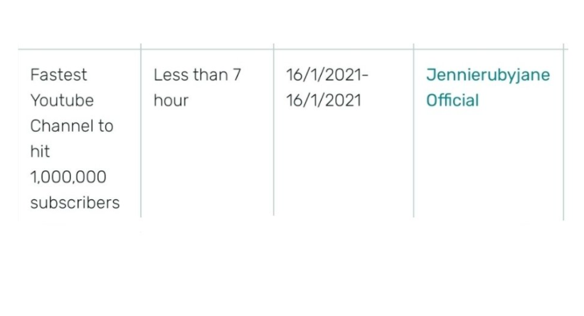 โดยแชแนล Jennierubyjane ของเธอนั้นเปิดตัวมาตอนนี้ยังคลิปแค่เพียงคลิปเดียวเท่านั้น แต่ว่ายอดวิวนั้นพุ่งไปถึง 10 ล้านวิว ส่วนทางด้านยอดผู้ติดตามนั้น ก็ทำ 1 ล้านแตกไปภายใน 7 ชั่วโมงแรก และได้กลายเป็นคนที่ทำยอดผู้ติดตามในยูทูปแชแนลของเธอแตก 1 ล้านซับได้ไวที่สุด