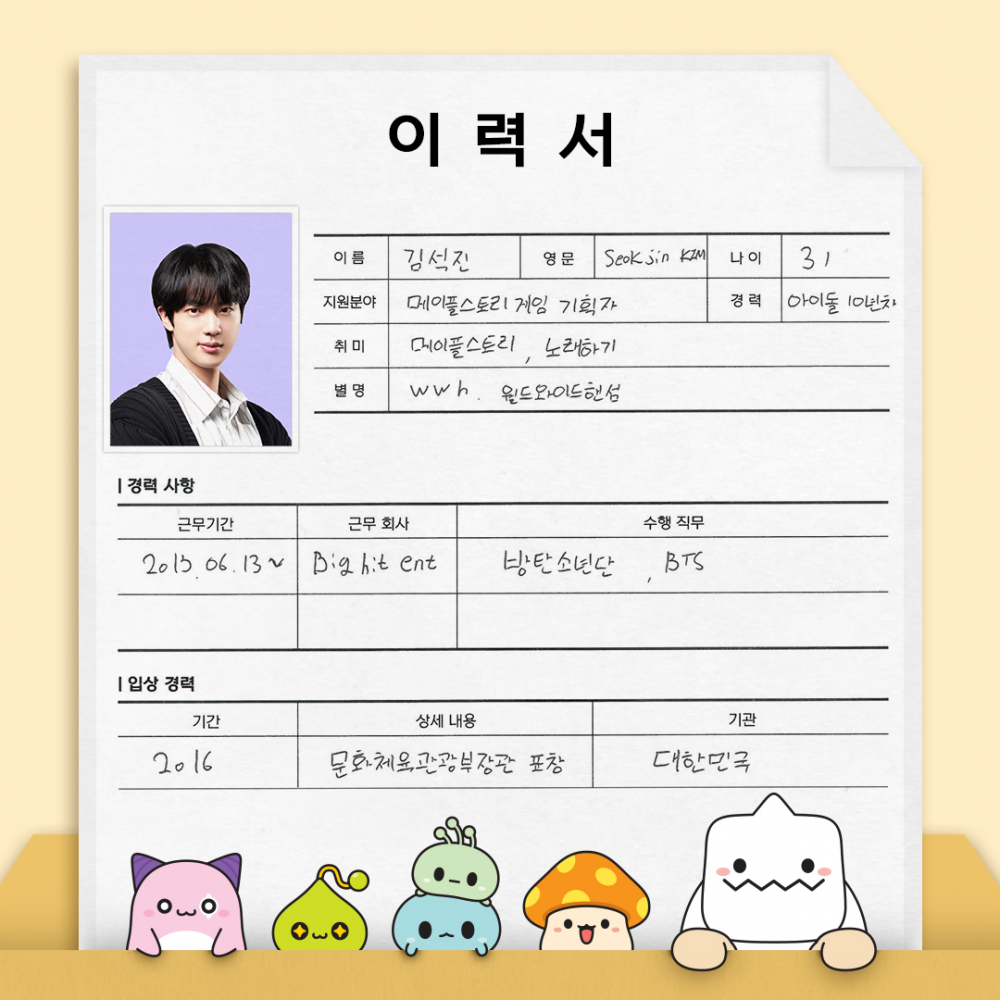 ส่วนที่น่าสนใจคือช่องประสบการณ์ ที่ไอดอลหนุ่มกรอกข้อมูลว่า “ประสบการณ์ 10 ปี ในการเป็นไอดอล” สถานที่ทำงานคือ BigHit ENT. ตำแหน่ง BTS (แค่นี้ก็ขำแล้ว) ส่วนงานอดิเรกของเขา คือ “เล่นเกม Maple Story” นอกจากนี้ ไอดอลหนุ่มยังสร้างเสียงหัวเราให้แฟนๆด้วยการกรอกชื่อเล่นของเขาว่า “Worldwide Handsome”