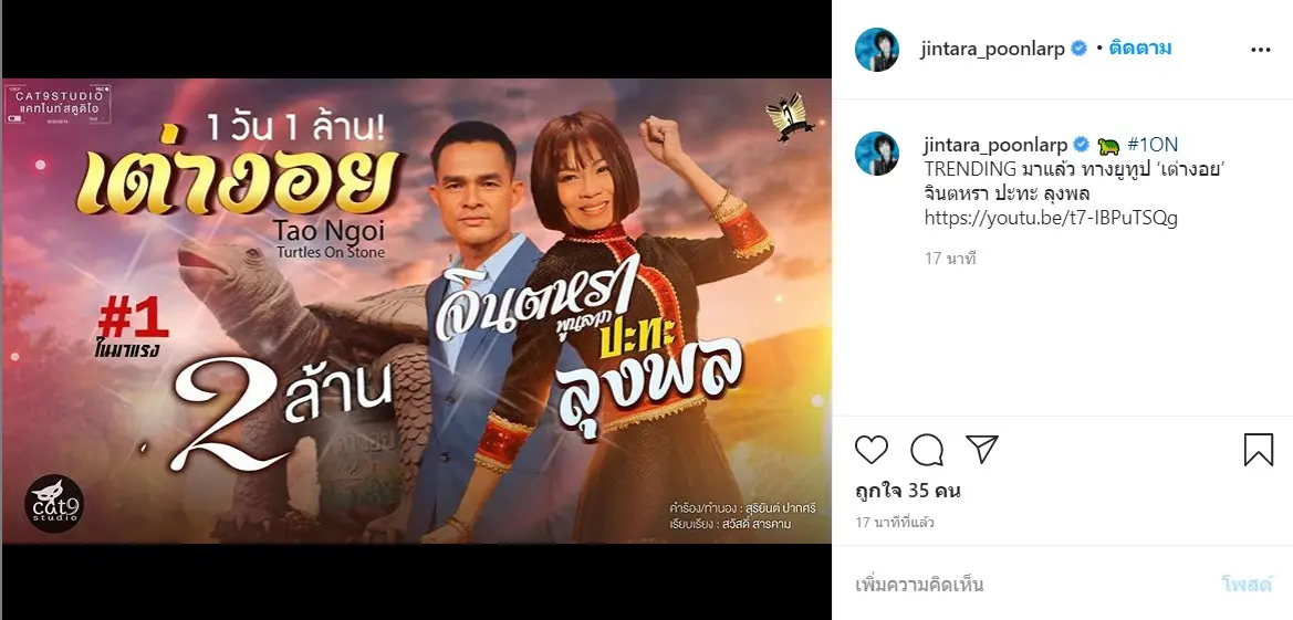ล่าสุด เพลงเต่างอย เวอร์ชัน จินตหรา ปะทะ ลุงพล หลังจากโพสต์ลงในยูทูปเพียงวันเดียว ก็ติดอันดับขึ้นเทรด์อันดับ 1 ในมาแรงของยูทูปประเทศไทย และยังมียอดวิวรวมที่บอกได้คำเดียวว่า ปัง! เพระยอดวิวนั้นยอดสูงถึง 2 ล้านวิวแล้ว