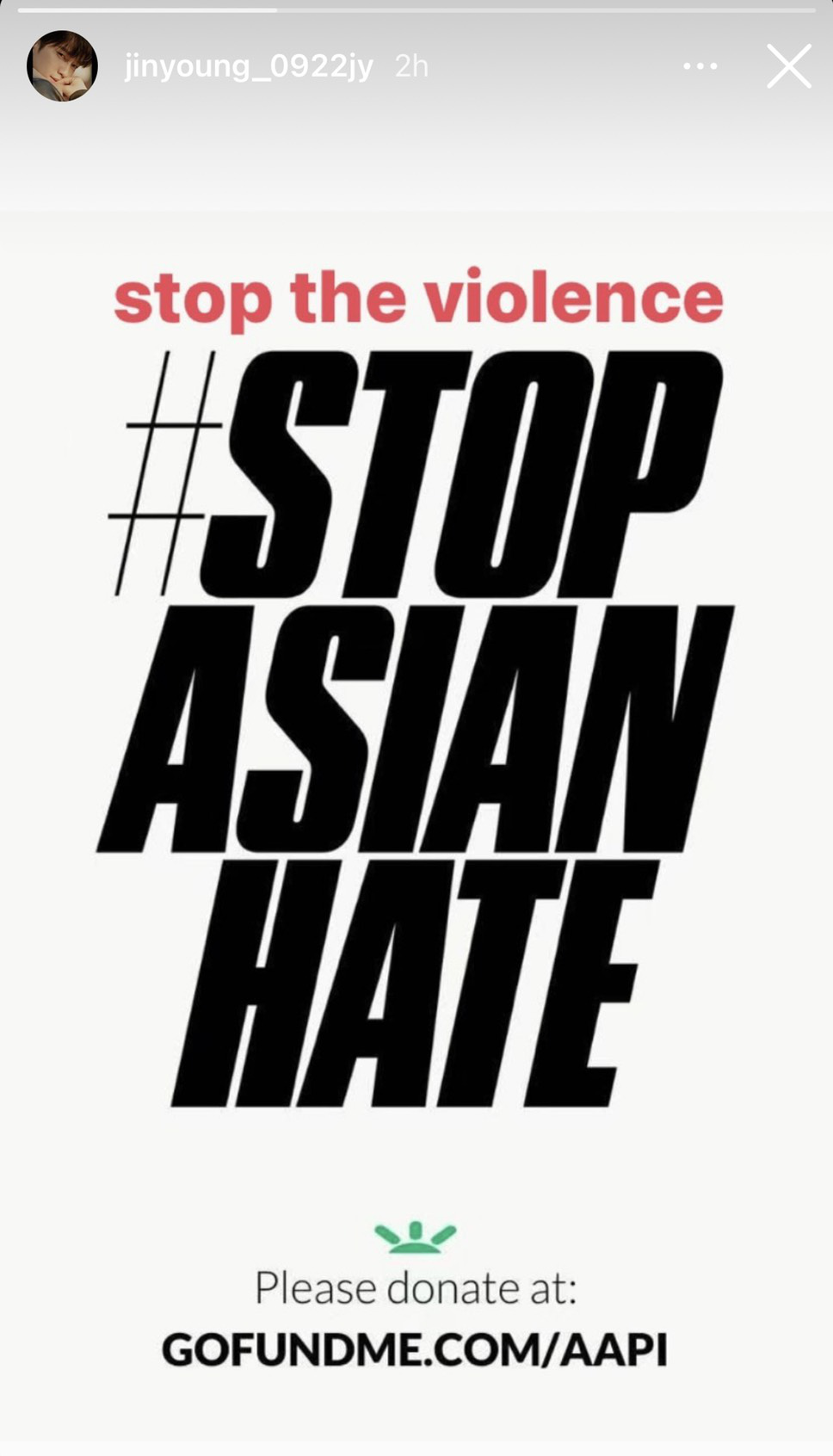 ในวันนี้ (19 มี.ค. 2021) หนุ่มจินยองก็ได้ออกมาโพสต์ไอจีสตอรี่ โดยเป็นภาพที่มีตัวหนังสือ #STOPASIANHATE และได้เพิ่มเติมข้อความไปด้วยว่า “stop the violence” หรือที่แปลว่า “ยุติความรุนแรง”