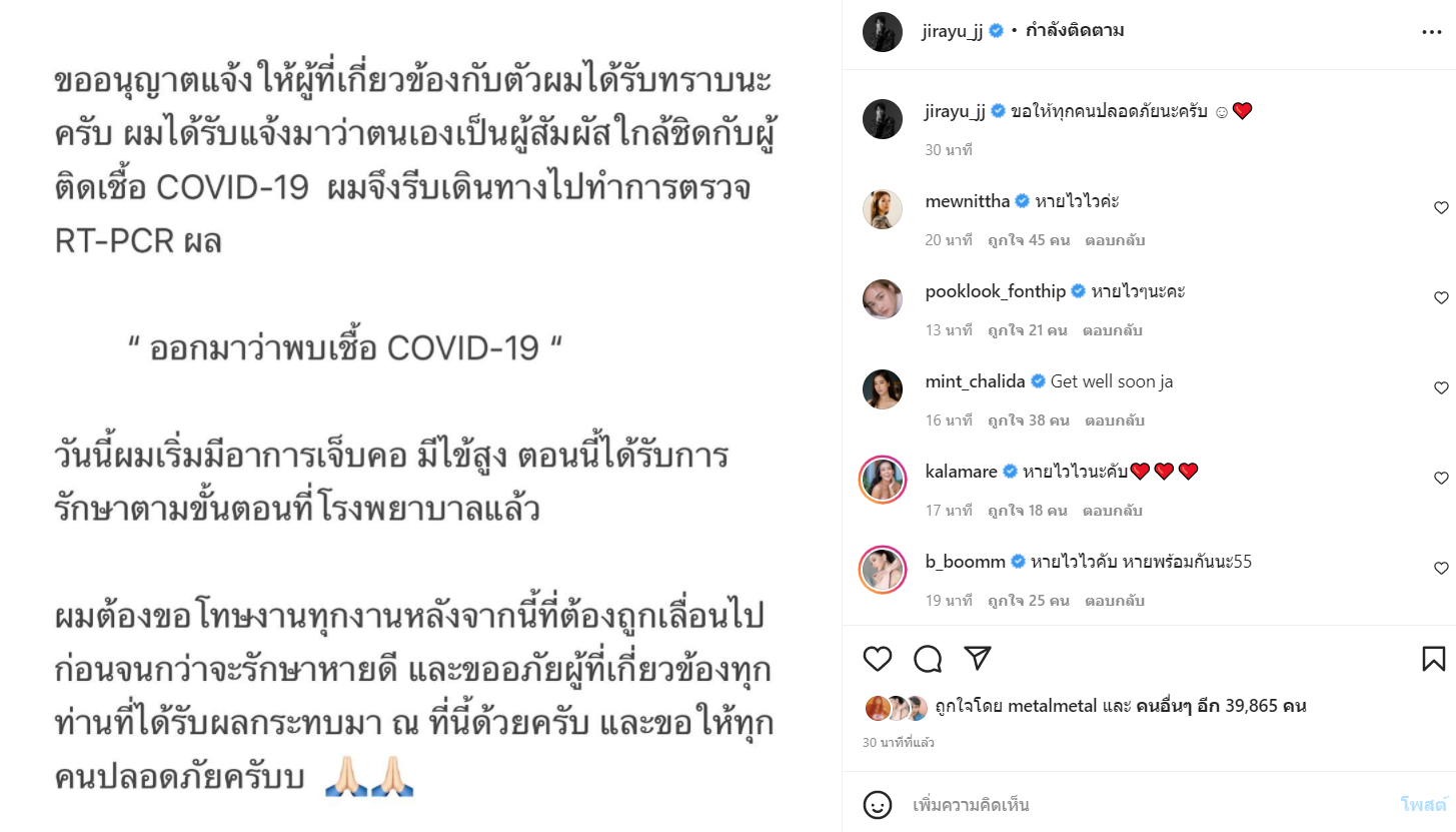 โดยเจ้าตัวโพสต์ว่า ขออนุญาตแจ้งให้ผู้ที่เกี่ยวข้องกับตัวผมได้รับทราบนะครับ ผมได้รับแจ้งมาว่าตนเองเป็นผู้สัมผัสใกล้ชิดกับผู้ติดเชื้อ COVID-19 ผมจึงรีบเดินทางไปทำการตรวจRT-PCR ผล “ออกมาว่าพบเชื้อ COVID-19” วันนี้ผมเริ่มมีอาการเจ็บคอ มีไข้สูง ตอนนี้ได้รับการ รักษาตามขั้ตอนที่โรงพยาบาลแล้ว ผมต้องขอโทษงานทุกงานหลังจากนี้ที่ต้องถูกเลื่อนไป ก่อนจนกว่าจะรักษาหายดี และขออภัยผู้ที่เกี่ยวข้องทุก ท่านที่ได้รับผลกระทบมา ณ ที่นี้ด้วยครับ และขอให้ทุก คนปลอดภัยครับบ