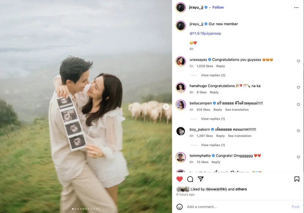 หลังโพสต์ถูกเผยแพร่ออกไป ก็มีเพื่อนๆ ดารา คนในวงการ และแฟนๆ เข้าไปคอมเมนต์แสดงความยินดีอย่างคับคั่ง เช่น