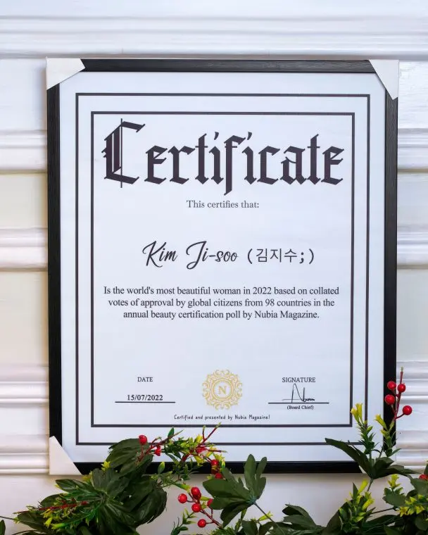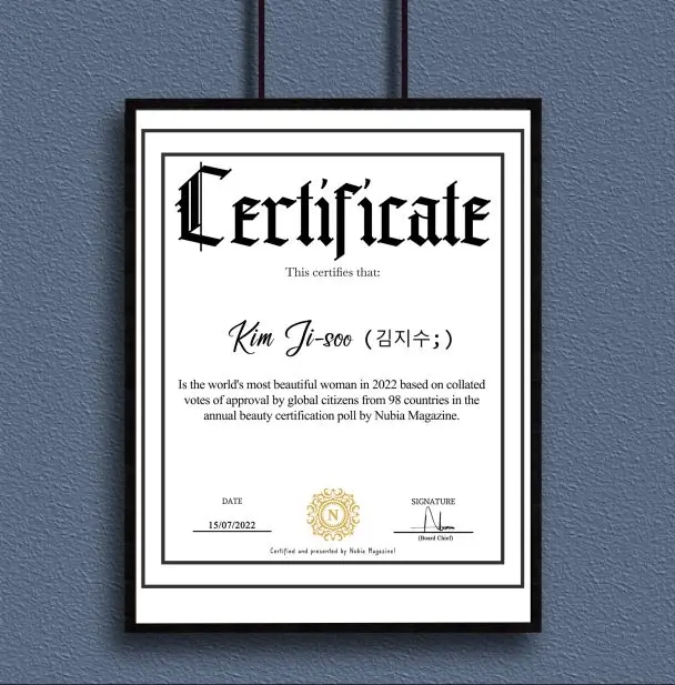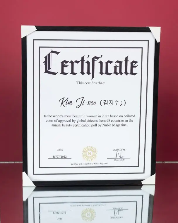 จากผลการสำรวจครั้งนี้ทำให้ จีซู ได้รับการรับรองอย่างเป็นทางการว่าเป็นผู้หญิงที่สวยที่สุดในโลกในปี 2022 นิตยสาร Nubia ได้ติดต่อกับ YG Entertainment เพื่อจัดส่งใบรับรอง